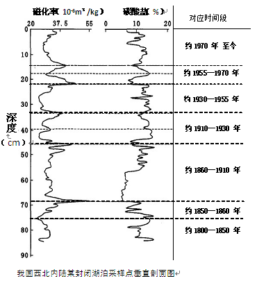 本题解析:1.本题考查地理图表的判读能力。采样点岩芯埋藏越浅,距当今时间越近;采样点岩芯的沉积年代约为200年;在68.5cm深处磁化率达到最大值,而对应的碳酸盐含量达到最小值;总体来看,磁化率变化曲线和碳酸盐含量变化曲线基本上呈反向变化。所以本题选择D选项。