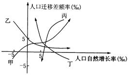 1.读题干,理解人口迁移差额率的含义,读图观察,甲城市人口自然增长率和人口迁移差额率都在上升,因此,甲城市人口增长速度加快;乙城市人口迁移差额率下降,但仍为正数,所以仍然是迁入大于迁出;丙城市人口迁移差额率下降为负数,人口由净迁入转为净迁出;