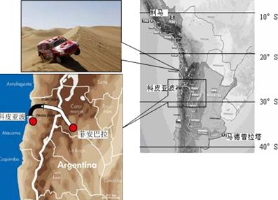 小题2:结合科皮亚波的经纬度位置和海陆位置判断当地为热带沙漠气候,由于终年受副热带高压或信风带控制,故终年高温少雨。在菲安巴拉至科皮亚波赛段翻越安第斯山脉,故自然带呈现垂直地带性分异。