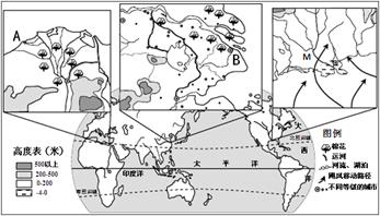 (1)A市所在地每一月盛行____________风,该盛行风使A地该季节形成了?的气候特征。(2分)