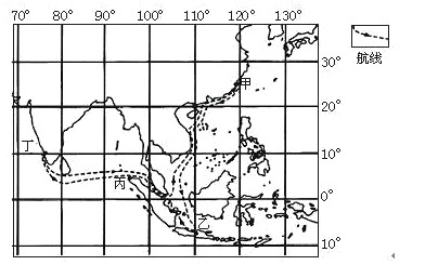 1、从甲地出发的最佳季节应该是 [? ] A.夏季 B.春末 C.冬季 D.初秋 2、从乙地经丙地,前往丁地贸易必须 [? ] A.在北半球夏季出发,经丙地直航到丁地 B.在南半球夏季出发,经丙地直航到丁地 C.在北半球夏季出发,航行到丙地等候下一个风季 D.在南半球夏季出发,航行到丙地等候下一个风季 |