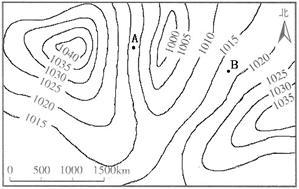 (2)大? A处等压线较B处密集,表明水平气压梯度力较B处大,因而风力较大