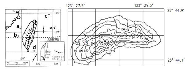 正在为“单人不间断环球航行”做准备的郭川于10月4日12点驾驶帆船抵达钓鱼岛8海里海域,日本海上保安厅出动6艘巡逻船,对其进行阻挠和拦截长达3小时。下面分别为我国钓鱼岛的位置图和等高线地图(单位:米)。读图回答下面问题。