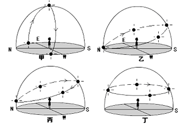 2、单选题 某年6月22日,“网络天文爱好者协会”的四位会员图示了各自所在地的太阳视运动状况,四幅图如下,试完成下列各题( )