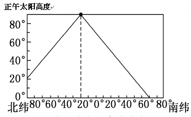 【小题2】6月22日,甲地正午太阳高度为90°,说明甲地位于北回归线,乙地在6月22日太阳高度的最低值为0,说明处于北极圈上。因为太阳直射点在南北回归线之间移动,所以,北回归线到北极圈之间的地区,正午太阳位于南方。6月22日,北回归线和北极圈之间地区昼长夜短,太阳从东北升起,西北落下。