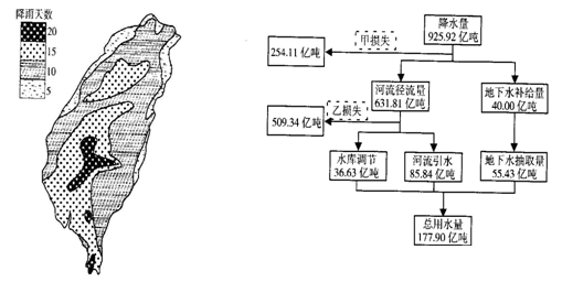 (2)从图中可以看出,降水量一部分变成了地表径流和地下径流,一部分为甲损失,可以看出甲损失为蒸发损失;河流径流量一部分进入水库和河流引水灌溉,一部分为乙损失,可以看出乙损失为河流径流入海损失。