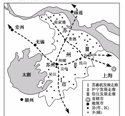 1、单选题 近年来苏州市沿江地带形成以冶金、能源、纺织、化工、粮油等基础产业为主的产业群体,图中Ⅰ、Ⅱ、Ⅲ示意苏州市城市化、工业化发展走廊,下列说法不正确的是