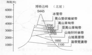 小题1:读图,图中山地基带植被是温带荒漠带,判断最可能位于我国的西部,D对。欧洲北部山脉基带是森林植被,A错。非洲南部山脉基带是热带草原植被,B错。南美洲东部地形高原、平原相间分布,没有太高的山脉,C错。