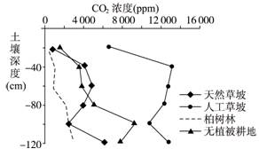 2、单选题 读“云南路南石林不同植被下土壤空气中CO2浓度示意图”,完成21~22题。