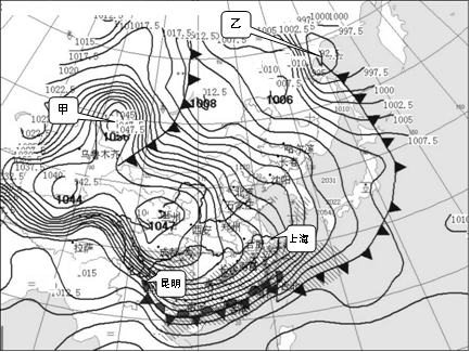 小题2:从气压分布状况看,甲处为__________,气压中心的名称是___________;从气流运动状况看,乙处为__________,在它控制下可能出现_________天气。