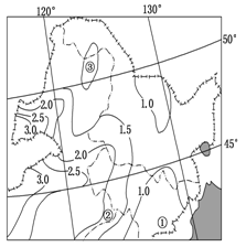 5、单选题 下图是我国东北地区年干燥度等值线图,年干燥度为年可能蒸发量与年降水量的比值。读图完成下列各题。