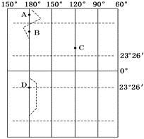 3、单选题 下图中D地此时是2012年12月21日的正午时刻,此时一艘轮船从A地出发,航行6天后到达B地,然后又继续航行10天,到达目的地C地(32°N)。据图回答小题。