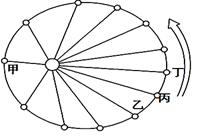 本题解析:位于北回归线附近,夏至日前后正午有直射现象;海口位于北回归线以南,正午日影有朝 南的现象;武汉、北京都在北回归线以北,正午日影只能是朝向正北,但武汉纬度低,正午太阳高度大。 由此可推断,①是海口,②是武汉,③是北京,④是广州。(2)结合上题分析,此时海口的正午太阳位于正北方向,故判断太阳直射点应位于北回归线附近,故判断为夏至日。(3)根据图示的近日点、远日点位置判断,甲位于近日点,时间为1月初,而丁位于远日点,在7月初,则夏至日6月22日,在远日点之间,即图示丙丁之间的位置。