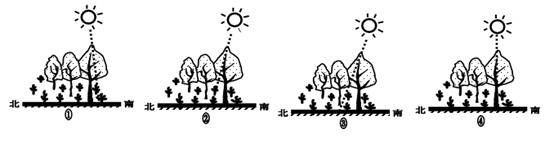 4、综合题 某日,广州、武汉、北京和海口四个城市的正午时分,同等高度的树木成影示意图如下