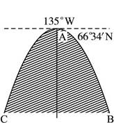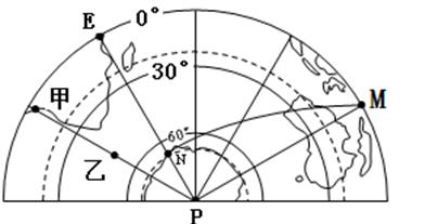 4、单选题 下图是以极点为中心的东半球图。此刻,曲线MN上各点太阳高度为0°,MN与EP相交于N点。该季节,北美大陆等温线向南凸出。读图回答问题。