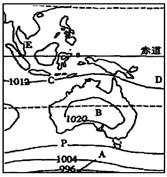 1.根据等值线的分布规律判断:图示等值距为8;且P与1004与1020都相邻,故P值为1012。2.D处位于南半球,故为东南信风;错误。