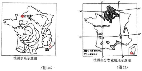 3、综合题 读“法国水系示意图”(图14)及“法国部分农业用地示意图” (图15),回答下列问题(19分)