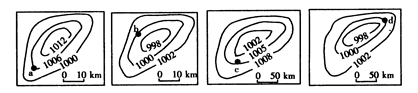 小题1:如果四图都位于北半球,a、b、c、d四地风向分别是