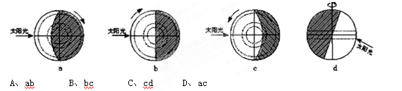 本题解析:a为从南极上空俯视图,南极圈及其以南地区出现极夜,为6月22日;b为从南极上空俯视图,昼夜平分,为3月21日或9月23日;c为从北极上空俯视图,北极圈及其以北地区出现极昼,为6月22日;d为侧视图,北极圈及其以北地区出现极夜,为12月22日。综上所述,D项正确。