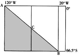 4、单选题 下图ACB为晨昏线,C为中点。图示范围仅阴影区为黑夜,其它地区为昼,据此回答下列小题。