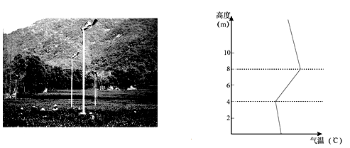 【小题2】由右图可知通常情况下在4—8米之间随着高度的升高,气温升高,有逆温层存在,安装在7-8米之间有利于将高处的暖空气往下吹到茶树上,使茶树减轻或免受霜冻影响,故选项B正确。