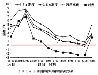 ①风扇吹出的热风可以使茶树免受霜冻影响 ②风扇可以把高处的暖空气往下吹到茶树上