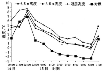 【小题3】仔细读图,注意图中不同高度防霜折线的图例差异及折线的温度变化范围。一般情况下温度在0℃及其以下发生霜冻,由下图可知“冠层高度”折线基本没有霜冻;“对照”在1:00到7:00之间有霜冻;6.5米高度的温度在6:00到7:00之间低于3.5米高度的温度;“冠层高度”与“对照”最大温差达5℃左右,故选项C正确。