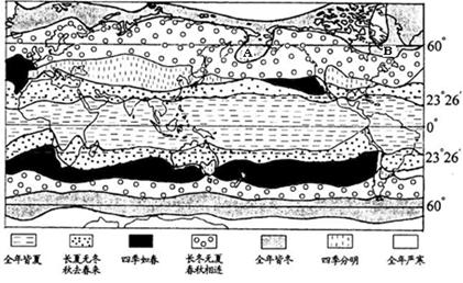 参考答案:(1)大致以赤道为中心南北对称分布;四季类型东西延伸,南北更替?(4分)