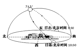 小题2:图示根据该地正午为北京时间的11:00,即当地时间较北京时间早1个小时,故计算当地的经度为135°E。故日出时间为北京时间的3:30,即当地时间的4:30;日落时间为北京时间的18:30,当地时间为19:30。