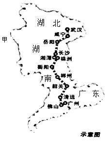 材料一:武广客运专线为中国的新建高速铁路工程之一,位于湖北、湖南和广东境内,是中国目前最长的铁路客运专线。全线全长约1068.8公里,途经200多座隧道。设计时速350公里/小时,最高时速394公里/小时,投资总额1166亿元人民币。客运专线的目的是为了缓解京广线的巨大客运压力。专线建成后,武汉到广州的时间由原来的11小时缩短到3小时,长沙到广州的时间由8小时缩短到2小时。
