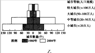 ? 经济的发展推动了我国城市化进程。图甲表示的是改革开放以来全国及国内三大经济地带城市化水平的变化情况,图乙是我国1980年和2004年城市等级规模金字塔示意图。