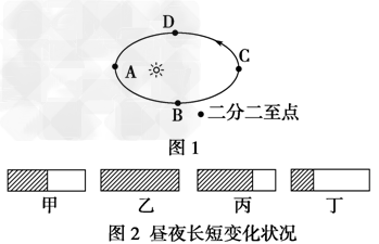 1.地球位于A点时,根据图2中昼夜状况(阴影部分表示黑夜)判断甲、乙、丙、丁四地中地球自转线速度最快的是