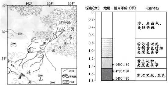 (1)右图所示地层,深度1.6米处是湖沼沉积,由此可推断该地的干湿状况,距今5000年前后比现在_______,理由是________________________________________________________________________________。