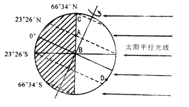 (1)读图,图示北极圈出现极昼现象,说明是6月22日前后。此时太阳直射纬度是北回归线,纬度是23.5°.