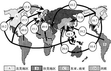 3、单选题  虚拟水是指生产商品服务所需要的水资源数量。虚拟水不是真实意义上的水,而是以“虚拟”的形式包含在产品中的“看不见”的水。图为“2002~2007世界农产品交易中地区间虚拟水资源的流动图(单位:109 m3/a)”。读图,回答题。