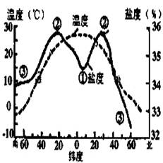 小题1:根据海水盐度副热带海区最高、依次向南北两侧递减,以及海水温度由低纬度向高纬度递减的规律(下图),可判断图中①②③分别是温度、盐度和密度线。进而可知,赤道地区温度高、盐度较低、密度小。