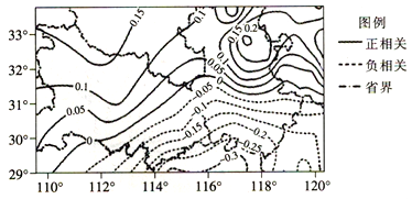 3、单选题 读1954~2005年我国江淮地区太阳黑子数与梅雨强度的相关系数分布图,回答下列小题。