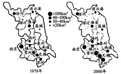 1.比较1979年和2000年城市用地面积情况图,我们可以发现整体上城市规模扩大了,但是并非每个城市都发生了明显的变化,因而A错误;这种用地规模扩大的不平衡性,反映了城市化水平区域之间差异的增大,B正确。