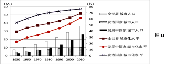 4、单选题 读1950~2010年世界城市化进程示意图(图11),回答题。