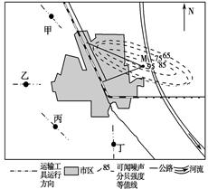 5、单选题 下图为我国华北平原某城市的可闻噪声分贝强度(单位:PNbB)等值线分布图,图中黑色圆点代表交通运输网中的点。读图完成问题。