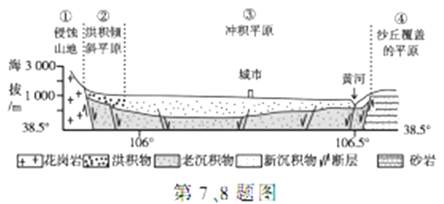 1、单选题 下图为我国某地沿北纬38.5°所作的地质构造、地貌剖面图,图中一般地势越高地下水埋藏越深,读图完成下面小题。