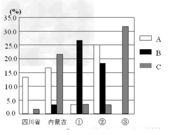 1、单选题 下图表示的是我国五个省级行政区的煤、石油和天然气三种矿物能源占全国总储量的比例,①、②、③分别与黑龙江、山西、新疆其中之一对应。读图回答1-2 题