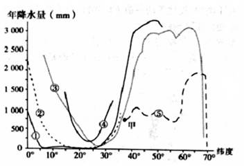 3、单选题 下图中五条曲线分别表示北美洲、南美洲、澳大利亚、欧洲和非洲大陆西海岸年降水量分布状况。读图回答题。