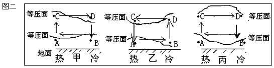 (3)读图二,甲乙丙三张图中,能正确反映地表冷热不均引起的环流(箭头表示空气流动方向)及其等