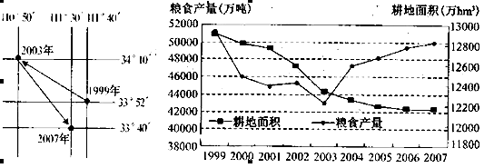 2、单选题 左下图为1999-2007年我国耕地减少的重心转移示意图,右下图为1999-2007年我国耕地面积与粮食产量变化曲线图。读图完成下列各题。