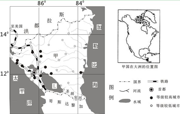 2、综合题 材料一:下图是甲国地图。甲国是美国重要的服装进口国,服装生产中心在A城;首都B城是该国重要的工业中心,纺织、食品、制糖是其主要工业部门。