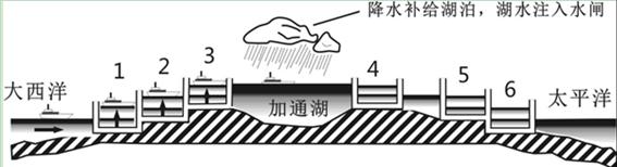 (4)读图可知湖泊与外流河相连,热带雨林气候,降水丰沛,保证注入水闸的湖水充足,湖面高于太平洋和加勒比海,湖水能自流注入水闸。