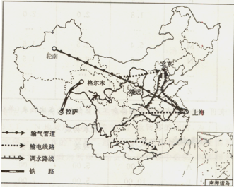 本题解析:本题考查我国的四大工程。(1)西气东输由轮南的沙漠干旱地区直到长三角的亚热带湿润地区。气候差异大;西气东输和西电东送最后目的地都有上海,为上海提供较清洁的能源,而减少了煤炭的使用,利用当地的经济和环境保护。对上海的影响从能源、经济、能源结构、环境等方面分析。(2)对西部的影响主要从资源开发、促进经济发展、增加就业、改善生态环境等方面分析;(3)水能资源主要从河流流量大和落差大两方面分析。