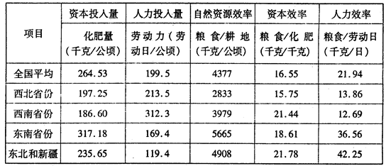 小题1:从表中可以看出,资本效率最多的是东北和新疆,单产是指粮食在单位耕地面积上的产量,故从自然资源效率可以看出单产最低的地区为西北省份。