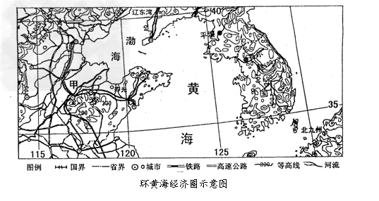 【材料一】环黄海经济圈是中、日、韩三国学者根据环黄海经济地区一中国辽东半岛、山东半岛地区以及苏北地区、韩国西海岸及东南地区,日本北九州及山口地区,在经济互补性基础上提出的一个区域交流层次的经济合作体系。环黄海经济圈示意图
